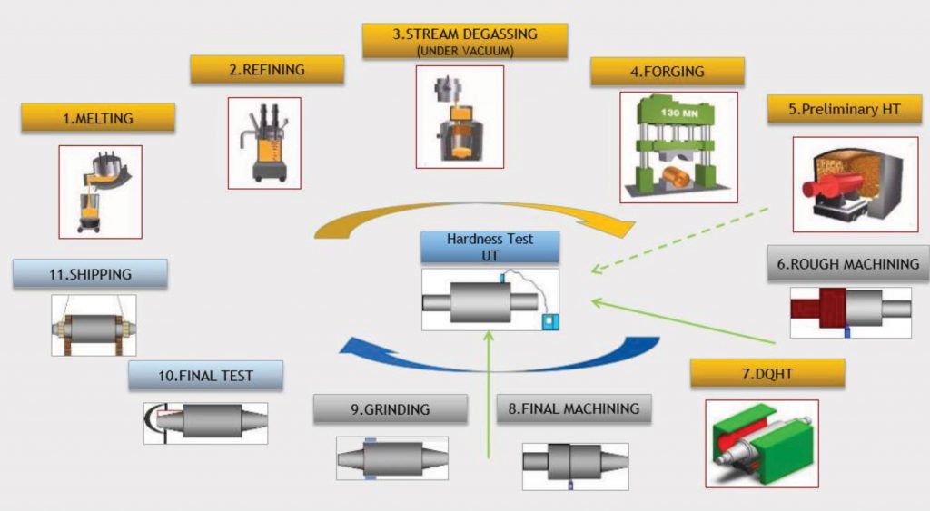 - National Supply represents a number of Mill Stand roll suppliers. We can supply a wide range of rolls, from Forged to Static and Spin cast. Grade types range from Indefinite chilled, EN-ICDP, Steel and graphitic steel, High Chromium cast iron, HSS, High Chromium steel and ½ HSS. Our suppliers will utilize the proper mix of carbon and alloy elements in the production of Back-up Rolls and Hot working Rolls for both flat and shaped products to achieve the required mix of different properties, such as hardenability, hardness, toughness, fatigue and thermal cracking resistance. All machining steps are performed by using modern Numerical Control Lathes. Each of our roll manufacturing facilities has the expertise, equipment and experience to meet the most demanding rolling mill applications. Our suppliers service many OEM’s and mills across the globe.
